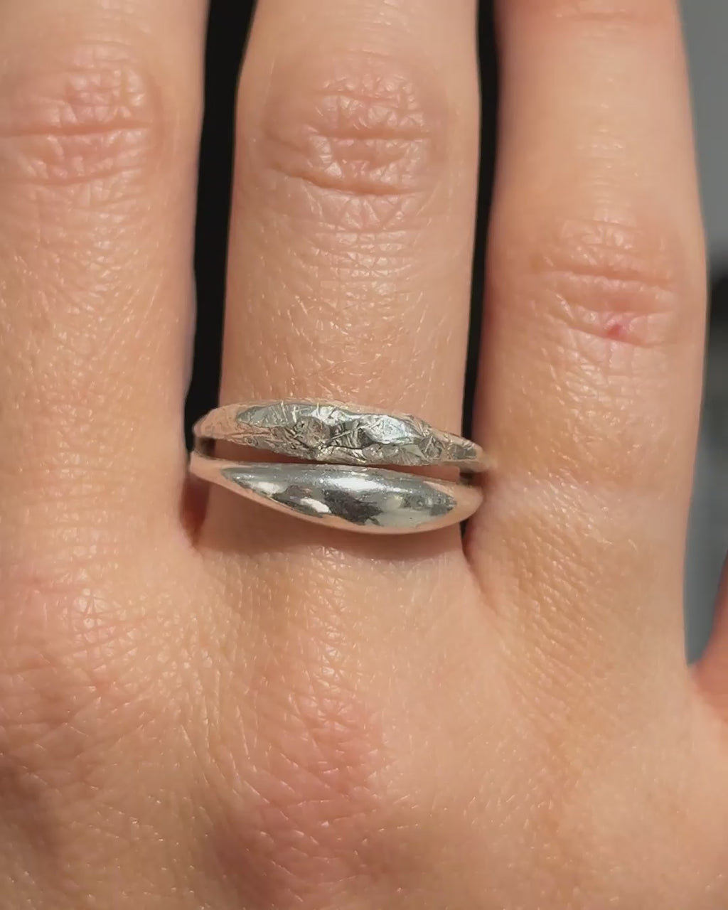 Un anillo de plata formado por dos partes que permanecen unidas, cada uno con su propia textura. Las texturas, diferentes pero conectadas, recuerdan que cada historia deja su huella.
