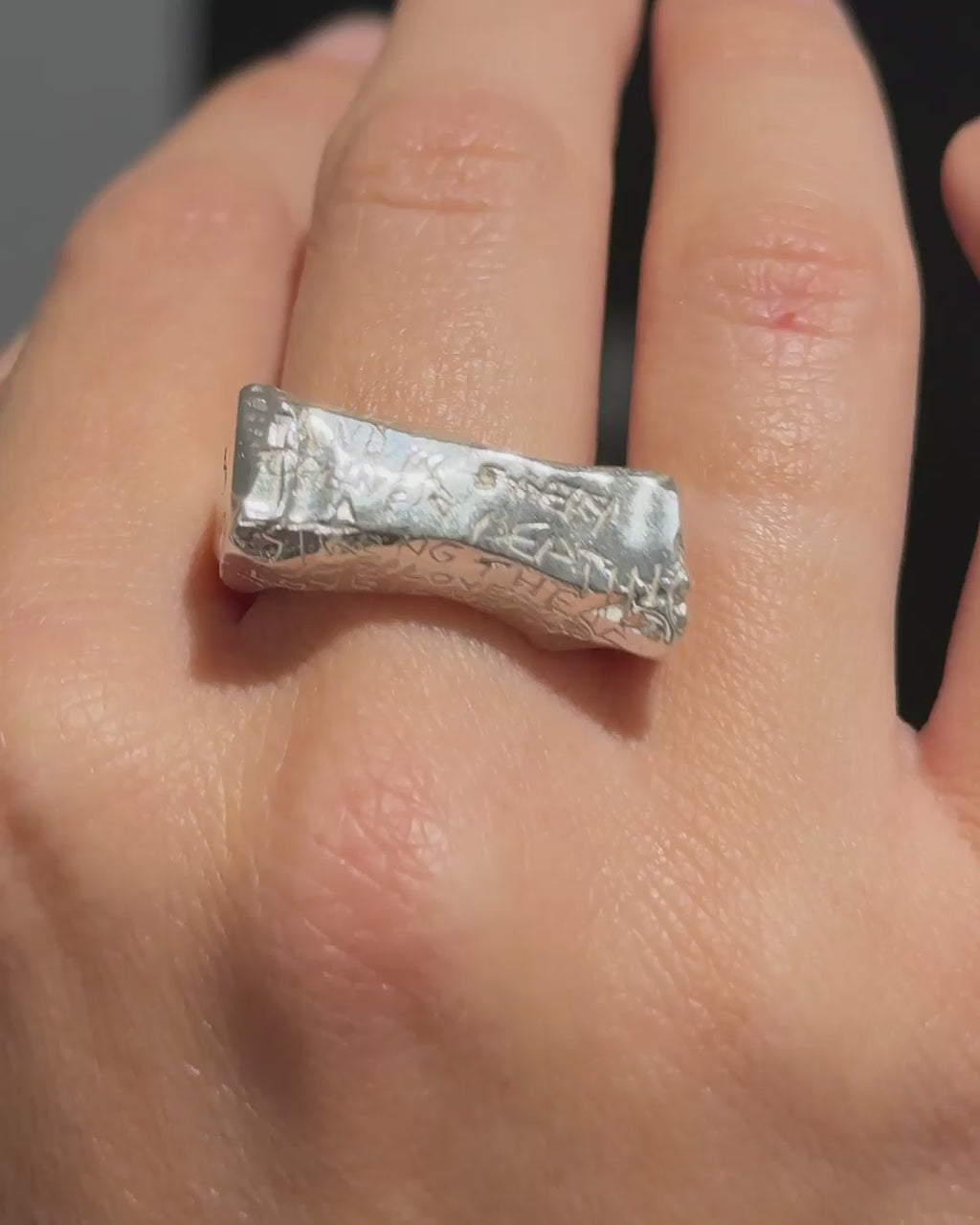 Un anillo que guarda la fuerza de un sello ancestral. Inspirado en la Piedra Rosetta, su superficie grabada recoge capas de tiempo, memoria y lenguaje: una forma de decir lo que permanece.