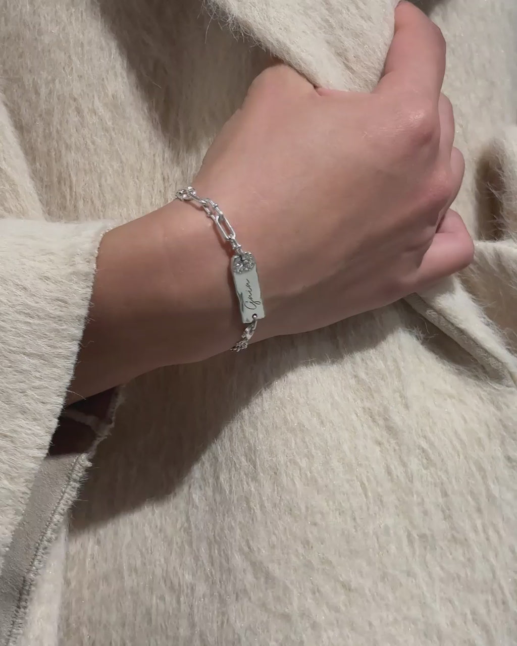 Una esclava de plata creada como pieza personal, pensada para llevar un nombre o una palabra. La placa frontal, de borde orgánico y acabado pulido, está lista para grabar y convertirla en un objeto íntimo. A un lado, un pavé irregular de circonitas.
