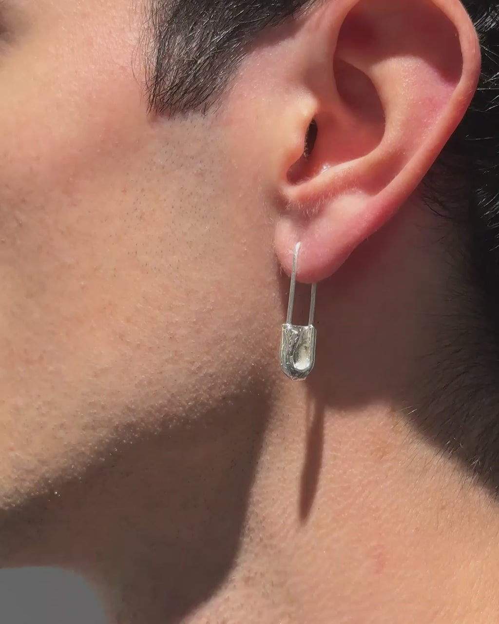 Pendientes de plata inspirados en el imperdible, un objeto que durante generaciones se llevó como amuleto para proteger a los recién nacidos y mantener cerca lo que importa. Modelados en cera y fundidos a mano, conservan la textura orgánica del metal trabajado con calma.